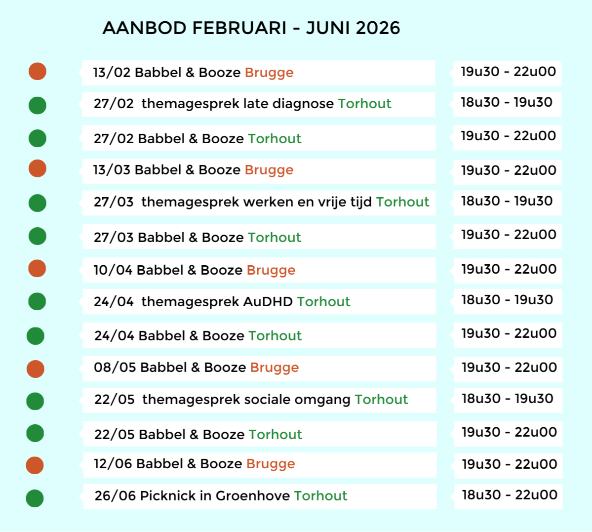 Babbel & Booze richt zich tot volwassenen en jongeren vanaf 16 jaar met autisme, ad(h)d en hooggevoeligheid, of kortweg neurodiverse personen. We richten ons specifiek tot mensen met een gewone tot hoge begaafdheid. Wij bieden namelijk geen individuele begeleiding aan. Er is uiteraard wél altijd begeleiding voorzien, maar wij kunnen helaas niet voor iedereen een aanbod op maat bieden. Wil je graag langskomen, maar heb je behoefte aan individuele ondersteuning? Breng dan gerust een vertrouwenspersoon mee!